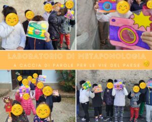 I bambini di 5 anni, armati delle loro macchine fotografiche “Catturaparole”, si sono avventurati per le vie del paese alla ricerca di parole nascoste per le vie. Questa attività li ha invitati a esplorare l’ambiente circostante con occhi curiosi, osservando insegne, cartelli, vetrine e ogni traccia di linguaggio scritto presente nel territorio.