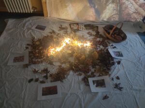 Gli elementi della natura che hanno accompagnato i bambini in questa esperienza immersiva sono stati: foglie, ghiande, noci, castagne, pigne, zucche, mele e melograno.