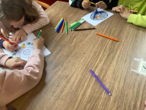 Man mano che finivano di ricamare, i bambini si sono dedicati, con l’aiuto degli anziani, alla colorazione di mandala pasquali, anch’essi lasciati in dono, come piccoli segni di affetto e allegria.